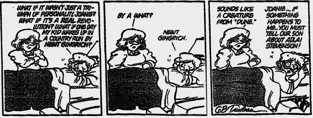 And for a certain type of idealistic Democrat, Stevenson would always be a political saint — an attitude that as gently mocked in the comic strip Doonesbury: