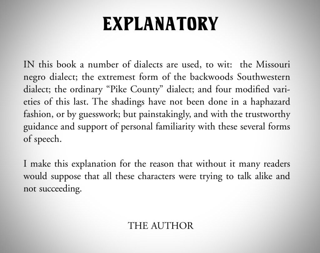 When I got all wore out wid work, en wid de callin’ for you, en went to sleep, my heart wuz mos’ broke bekase you wuz los’, en I didn’ k’yer no’ mo’ what become er me en de raf’. En when I wake up en fine you back agin, all safe en soun’, de tears come, en I could a got down on my knees en kiss yo’ foot, I’s so thankful. En all you wuz thinkin’ ’bout wuz how you could make a fool uv ole Jim wid a lie. Dat truck dah is trash; en trash is what people is dat puts dirt on de head er dey fren’s en makes ’em ashamed.”