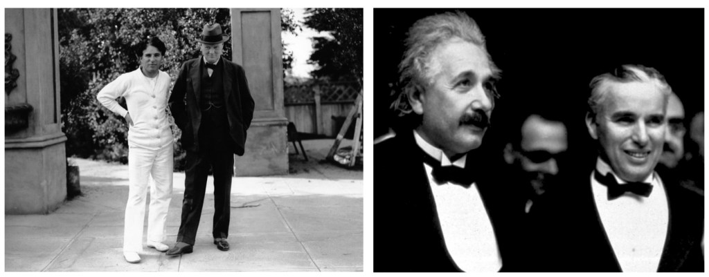 But one of his feature length silent movies, City Lights (1931) must rank as among the greatest movies of any kind ever made — as well as one of the most anticipated while it was being made.  The movie loving public was eager to see whether the viruoso of silent comedy could fulfill his genius in the sound era. Winston Churchill, always eager to be where important things were happening, visited Chaplin on the set halfway through the making of the movie. Albert Einstein was Chaplin’s personal guest at the opening.