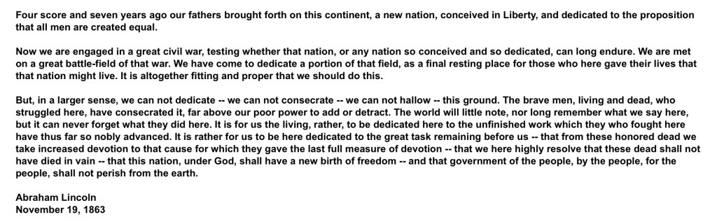 My acquaintance was surprised by this suggestion. He didn’t know much about Lincoln and had never read the address. But he wanted to know why I had thought of it — a speech, of all things. I went into the house and got a book that I knew included the text of the address. Back on the porch, I read it out loud, slowly and carefully. Here is the full text — I recommended that you read it out loud yourself: